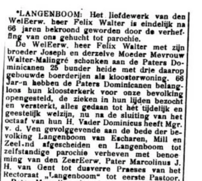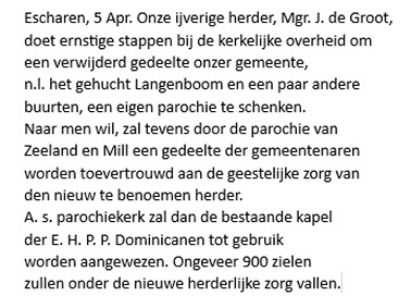 “Het Kerkbestuur van Zeeland zal onder goedkeuring van Zijne Doorl. Hoogw. den Bisschop gaarne een gedeelte der parochie overdragen aan de Eerw. Paters van Langenboom.