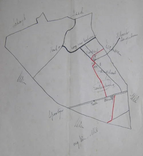 Gelukkig is er een schetsje gemaakt van deze grensscheiding tussen de parochies van Zeeland en Langenboom waardoor het mogelijk is om te volgen. De grens ging dus nog een behoorlijk stukje over de huidige Middenpeelweg heen, zelfs tot voorbij de weg Uden-Mill.