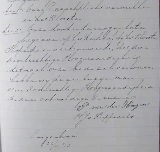 Wil men op de Langenboom meer hebben, dan keurt het Kerkbestuur dit af en op deze voorwaarden heeft de ondergetekende dan ook riet meermalen gezegd: ïk vind het goed”.