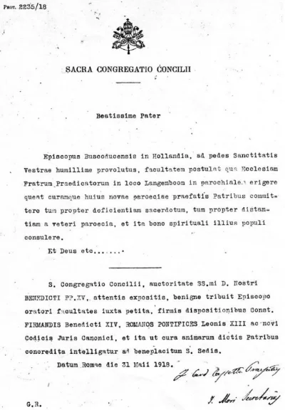 Ook vanuit Rome waren er geen moeilijkheden en oorspronguit kwam er op 31 mei 1918 een officieel schrijven, dat de nieuwe parochie van start kon gaan.