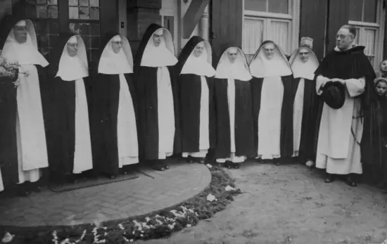 Pastoor Bruens heette de Zusters welkom. V.l.n.r.: Zr. Coletha – Zr. Norbertha – Zr. Henrico – Zr. Genoveva – Zr. Cornelia – Zr. Amata – Zr. Fabiola (gast) en Zr. Imelda.