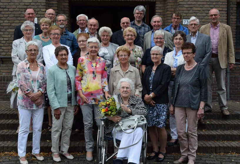 De jubilarissen Cees de Klein – Toos Verstegen-Reinen – Toos vd Horst-Cuppen – Jan Verstegen – Wim Rutten en vooraan Annie Arts-Bisseling