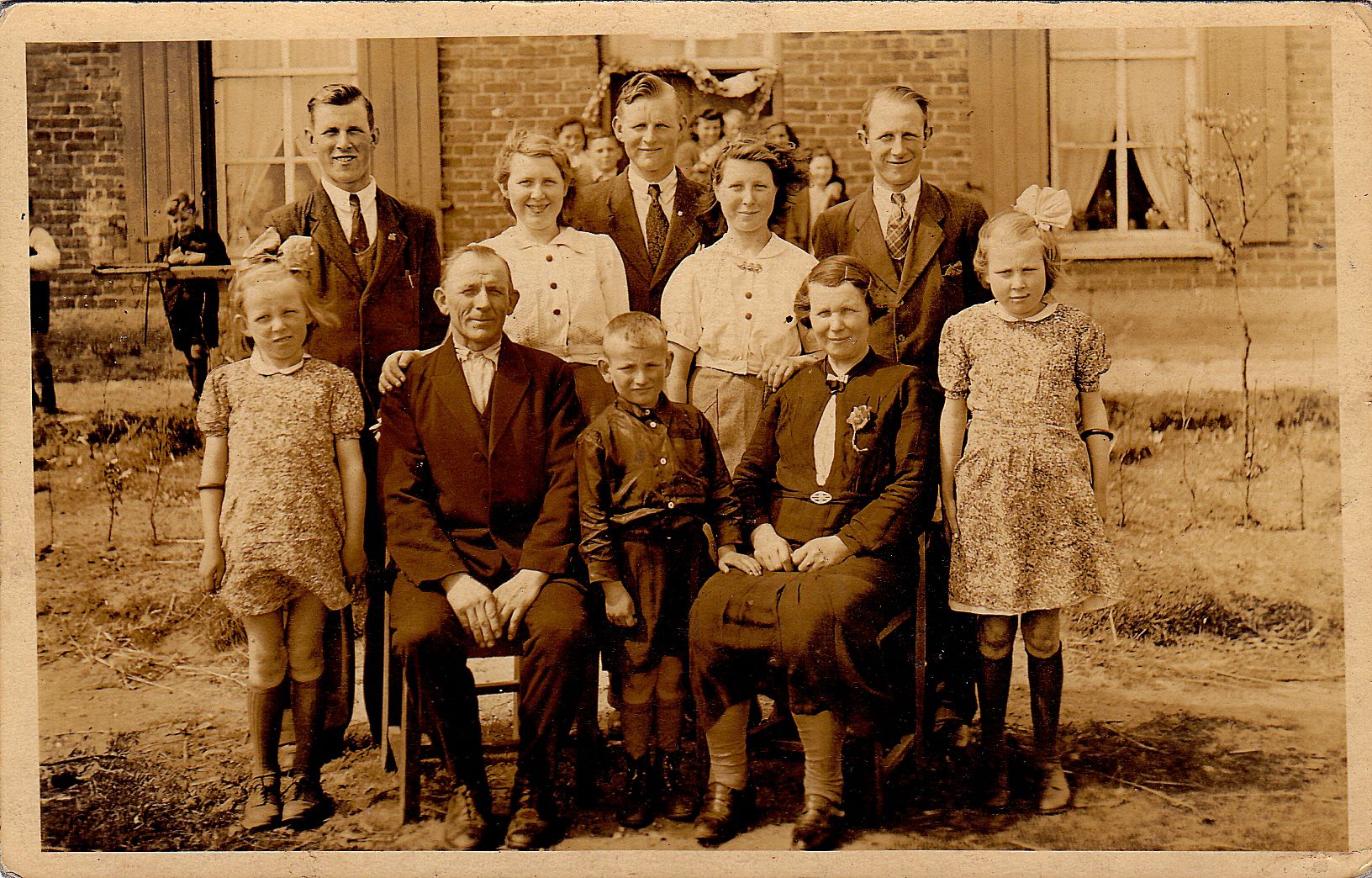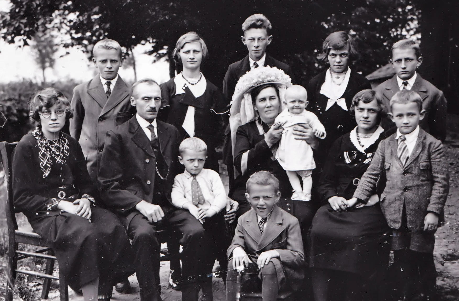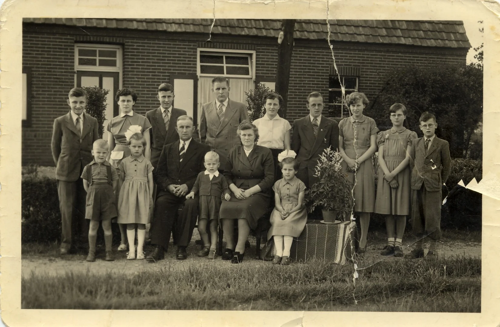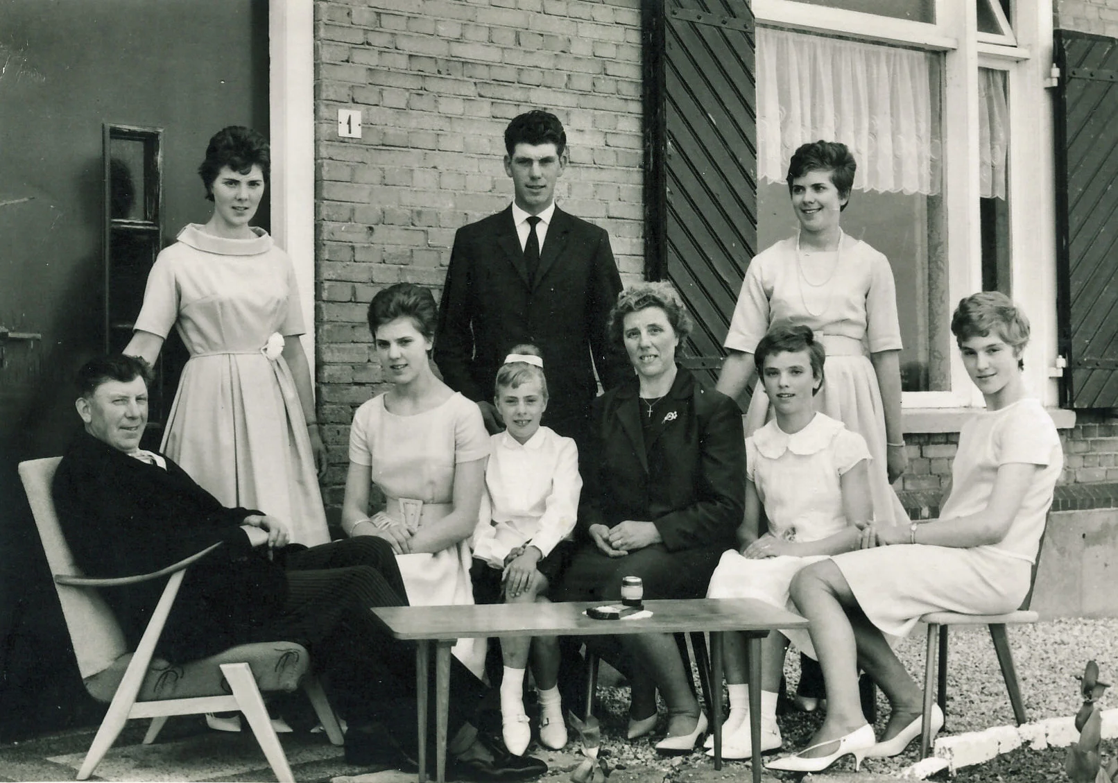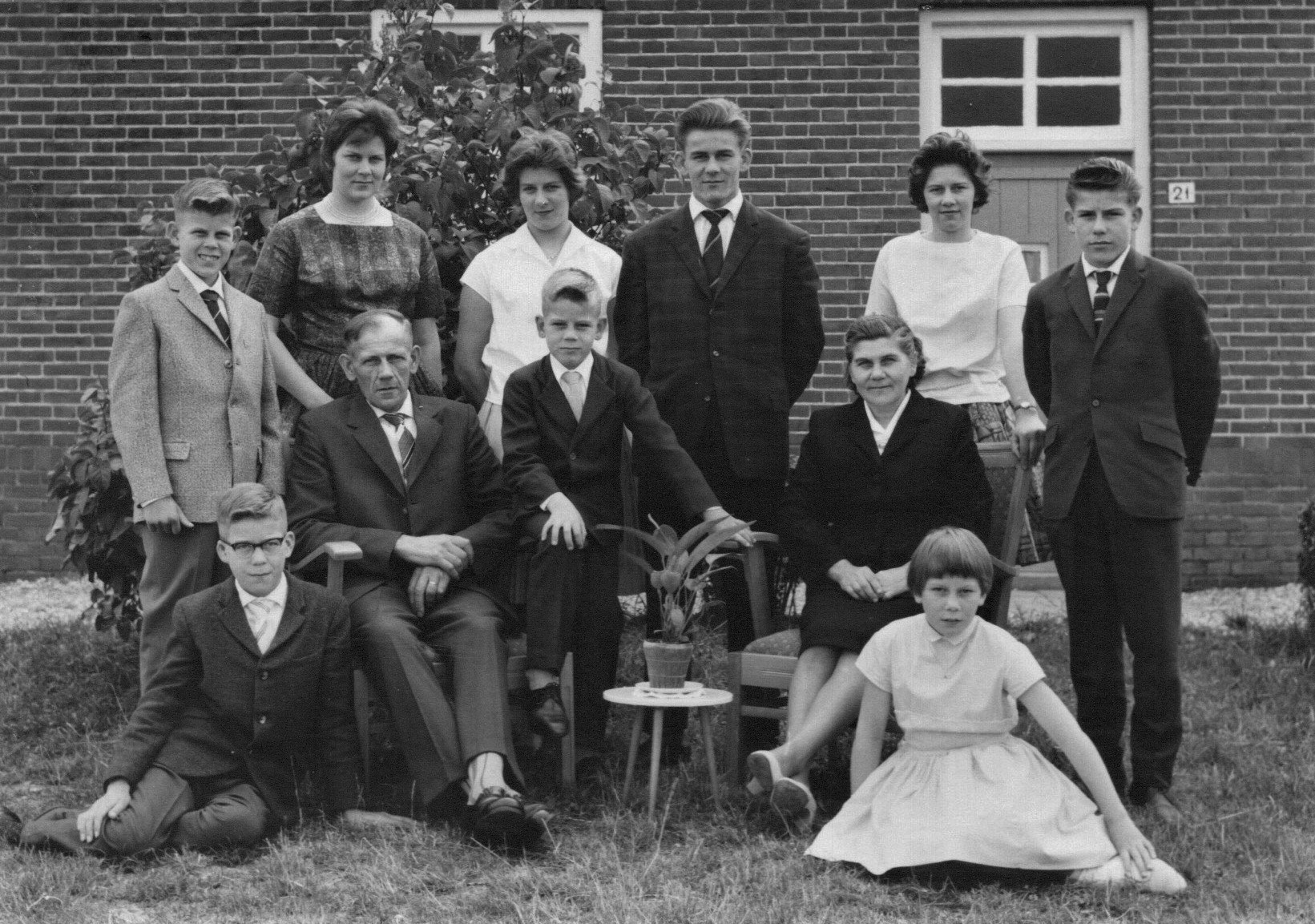 Bovenste rij: Trix – Ad – vader Toon – moeder Riek – Bert – Hennie – Marijke – Gerrie en Tonnie