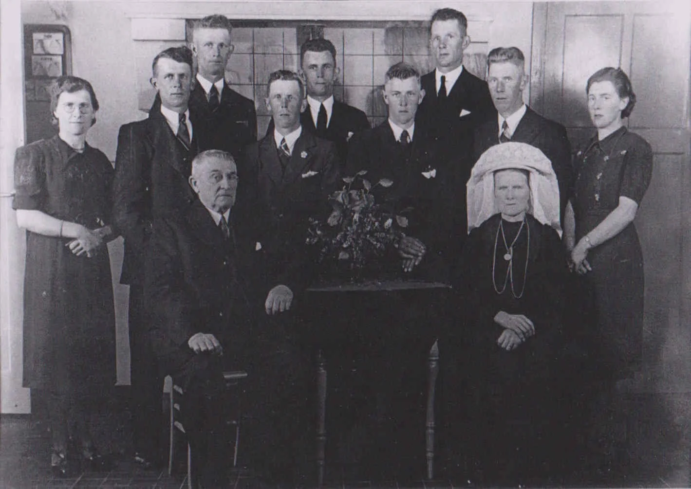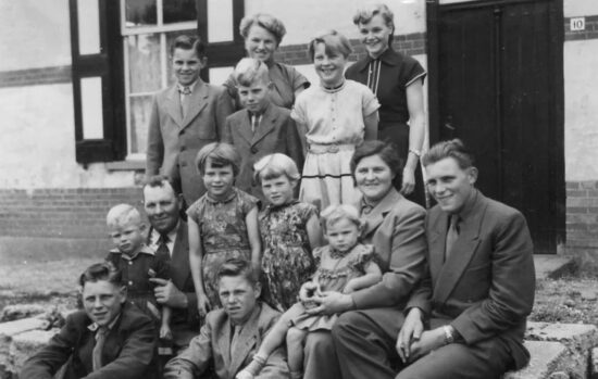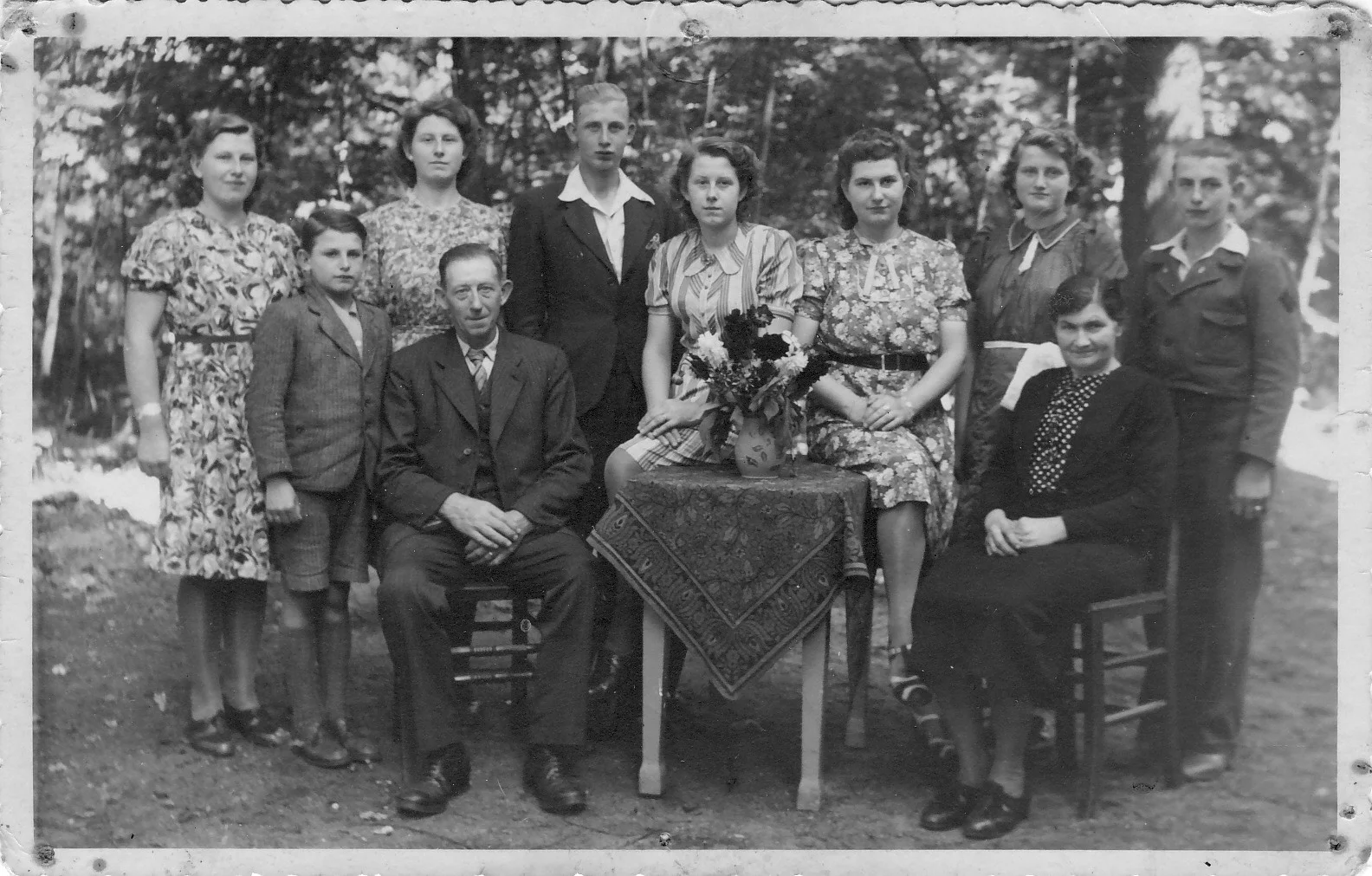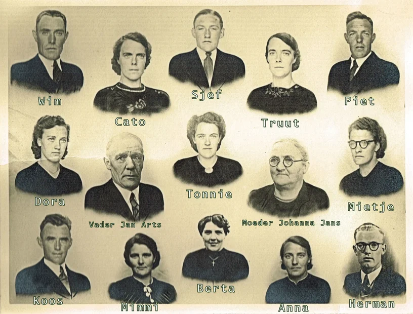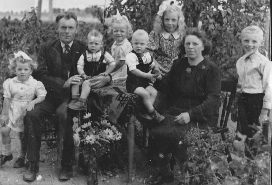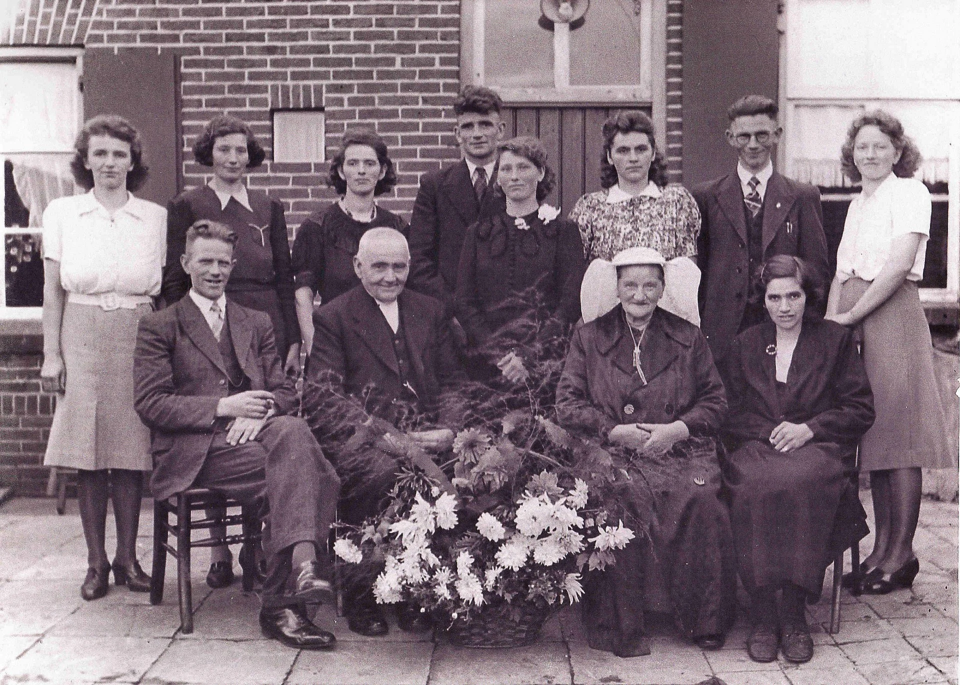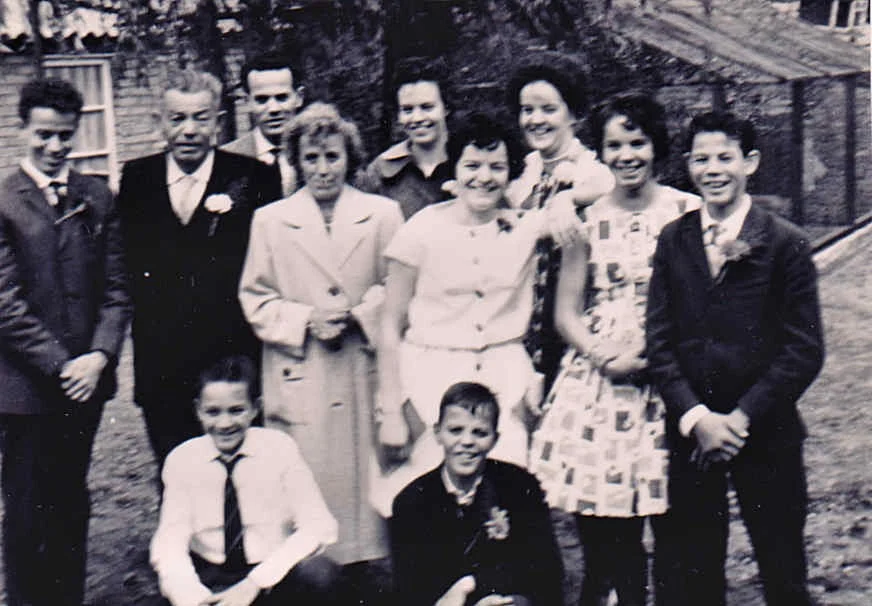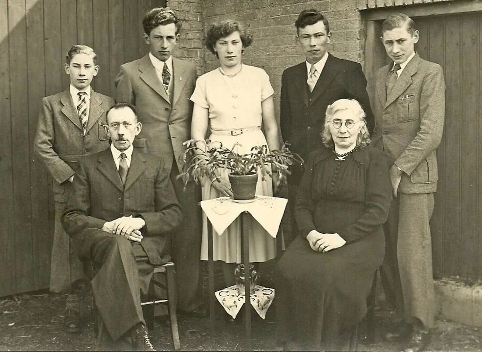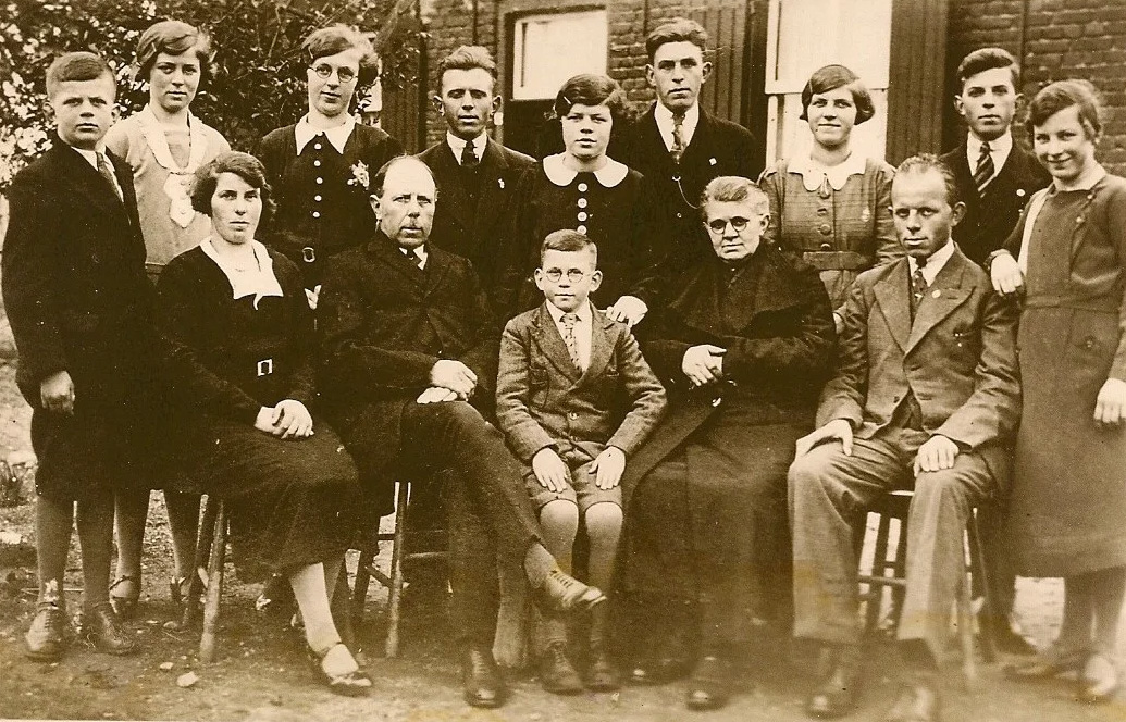 Bovenste rij: Trix – Ad – vader Toon – moeder Riek – Bert – Hennie – Marijke – Gerrie en Tonnie