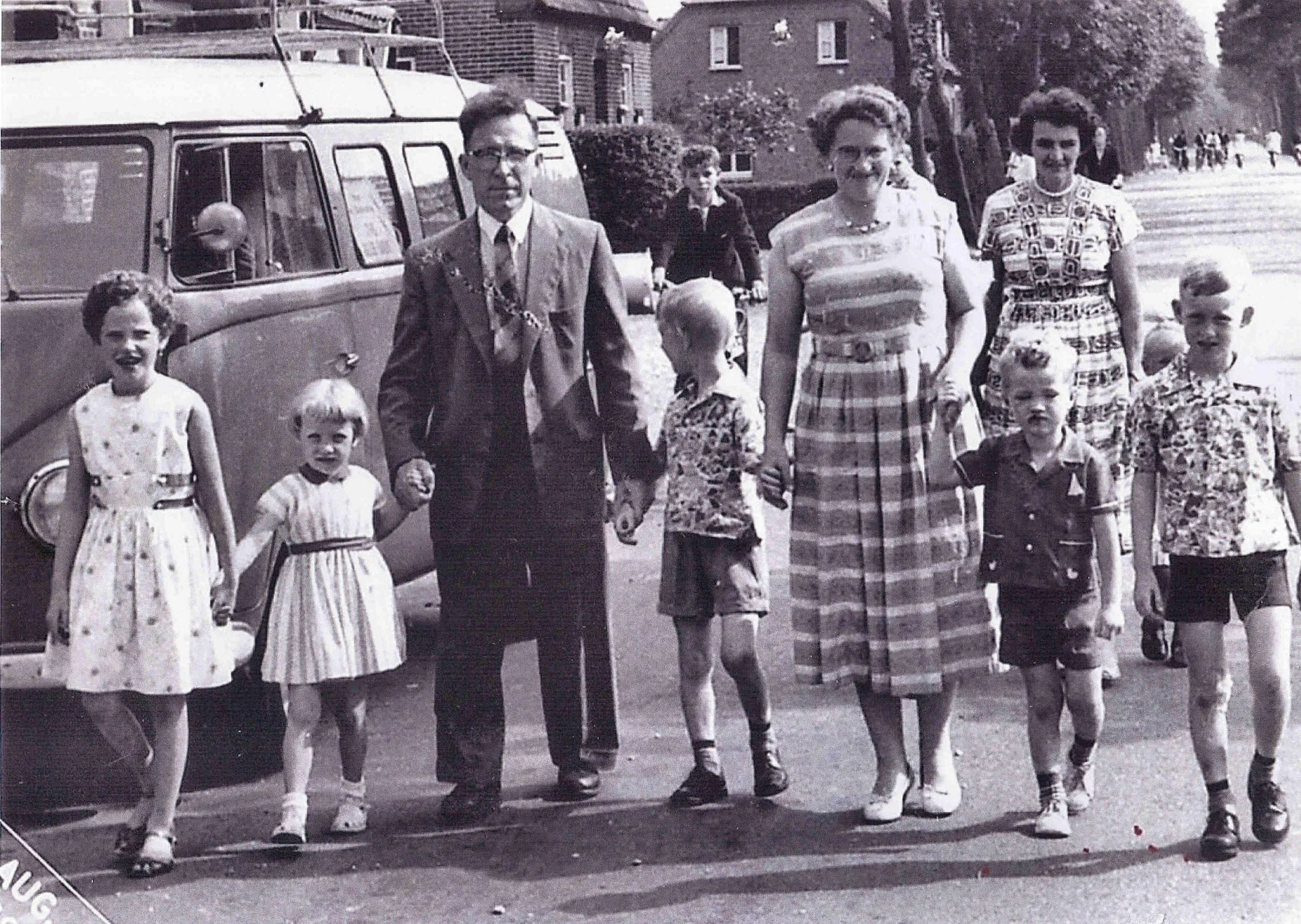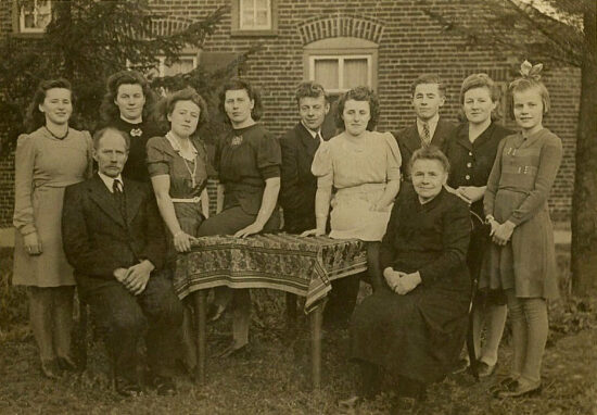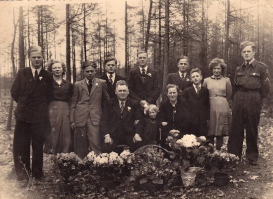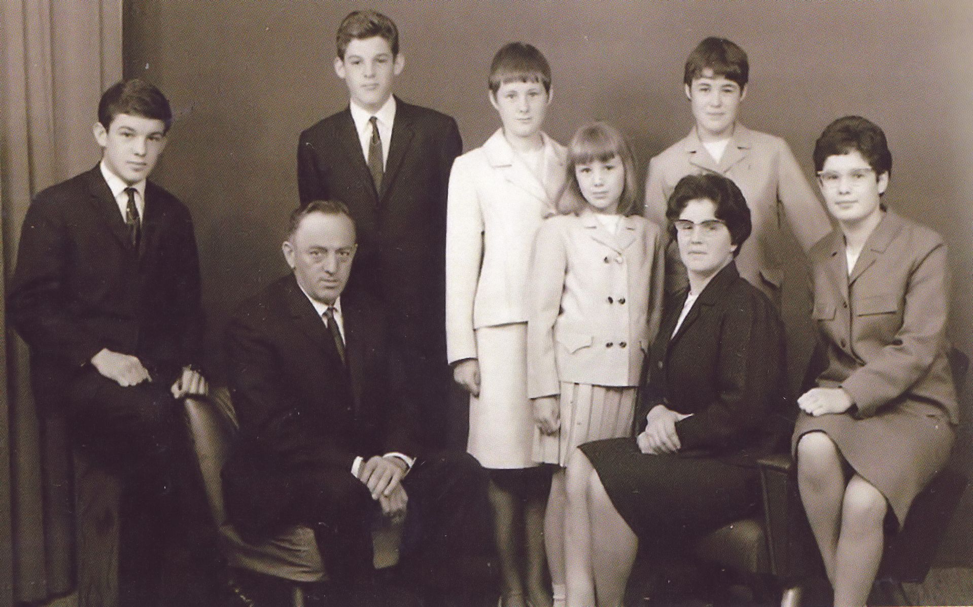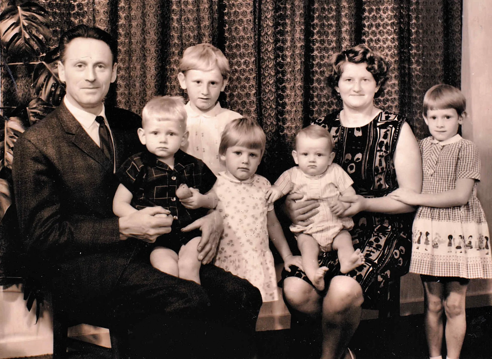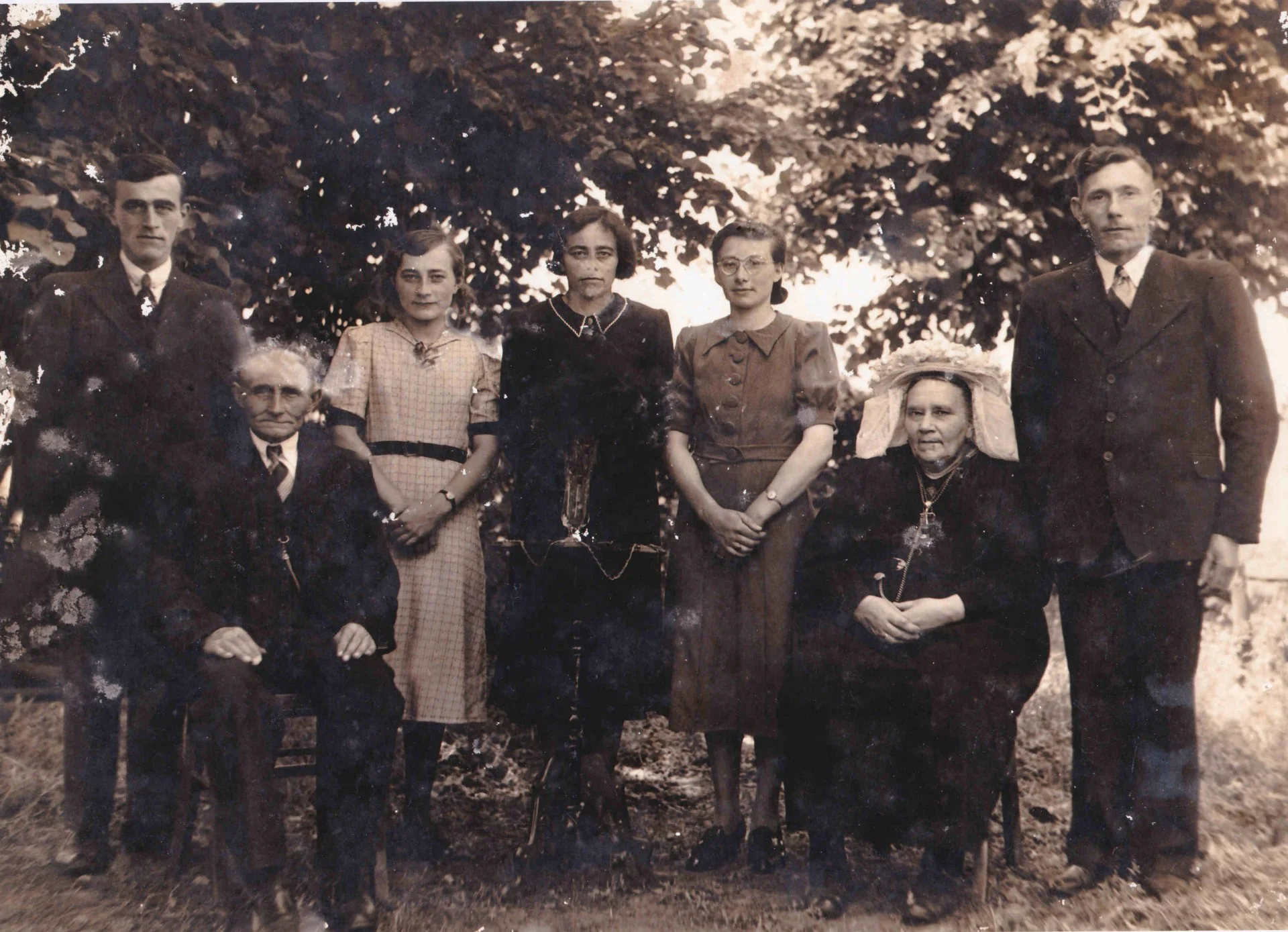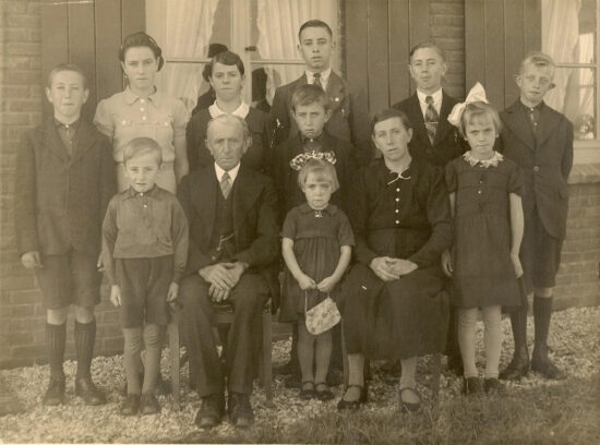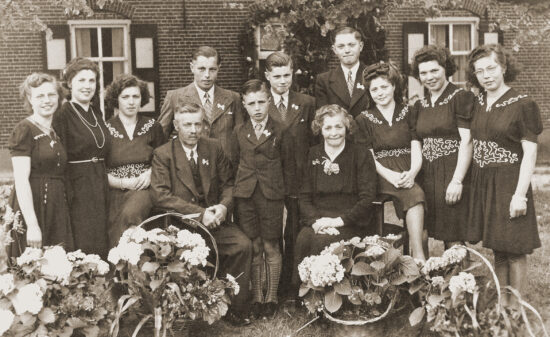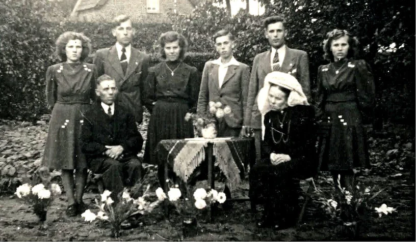 Bovenste rij: Trix – Ad – vader Toon – moeder Riek – Bert – Hennie – Marijke – Gerrie en Tonnie