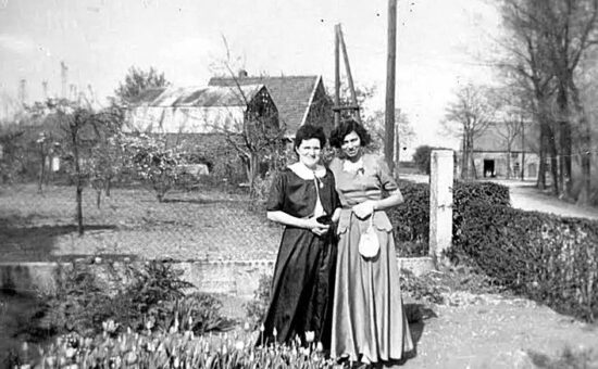 Foto genomen in 1944 bij het huis van Mw. Verstraten aan de Kloosterstraat. Annie Verstraten staat hier samen met haar vriendin Ans Roukens. Op de achtergrond rechts het huis van Wim Jans (Nu appartementen D’n Tip) en links het huis met werkplaats van Toon van der Horst, de aannemer.