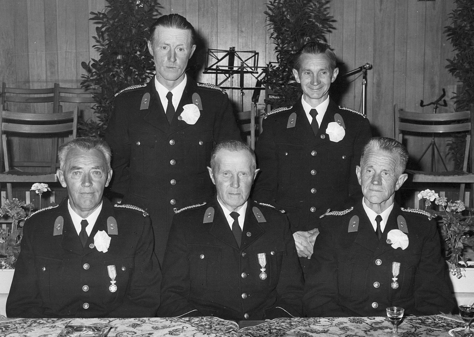 2e rij: Harrie Willems (grote trom) -Jo Verstegen . Jan Verstegen – Hendrik Derks – Klaas van Kuppeveld (penn.) – Toon Ermers (secr.) – Pastoor H. van Ooy – Toon Theunissen (voorz.) – Tiny vd Ven – Martien Derks (instr. drumband) – Wim Janssen (dirigent fanfare) – Jo van Ras en Koos Arts