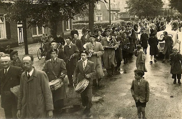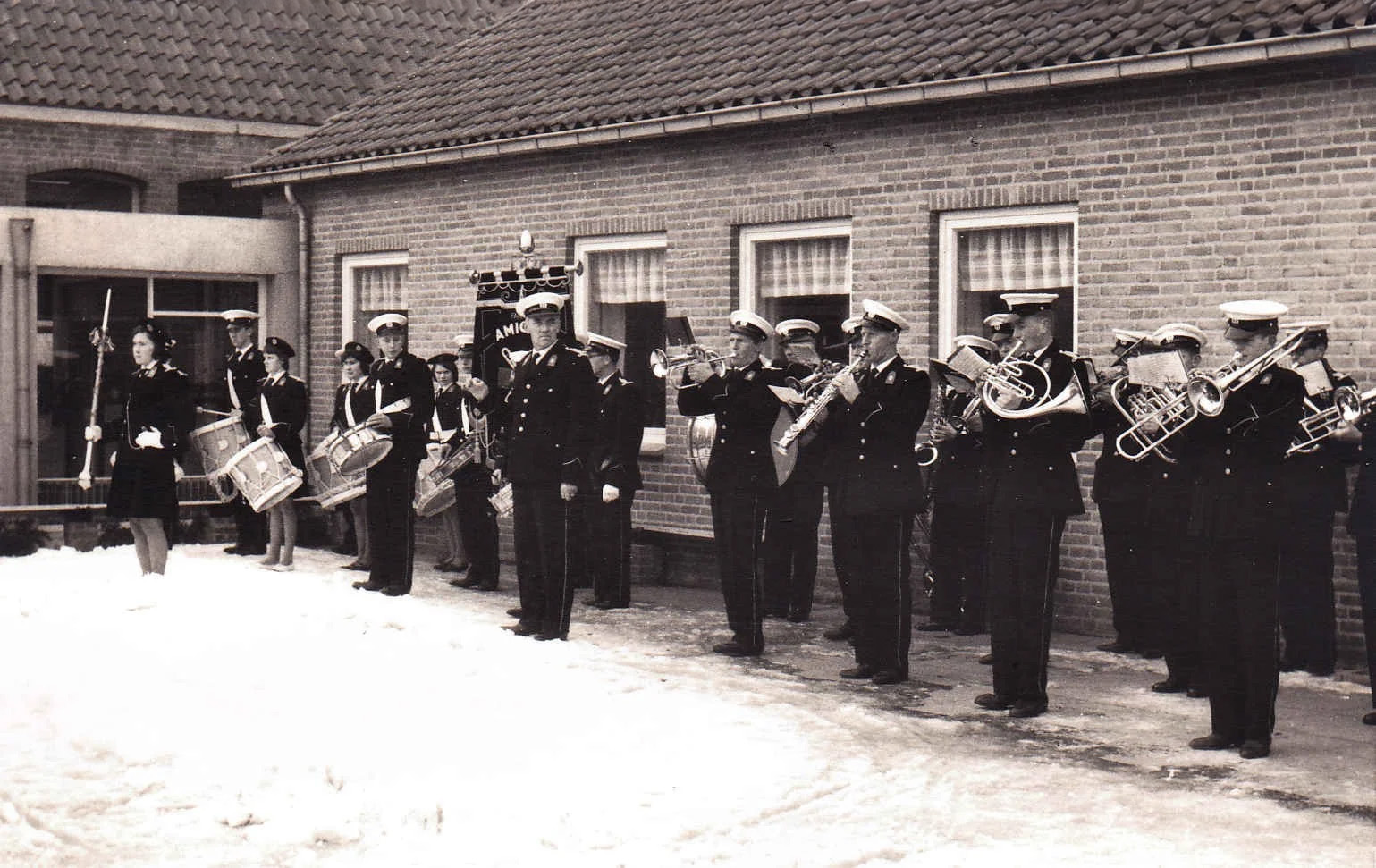 November 1959: Opening VGLO-school, natuurlijk muzikaal opgeluisterd door de fanfare. Te zien o.a. dirigent Koos Arts – trommelaar Diny Verstegen – Toon Jans – Toon Theunissen en Harrie vd Linden.