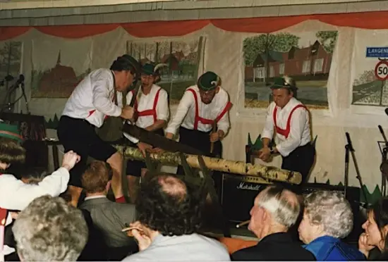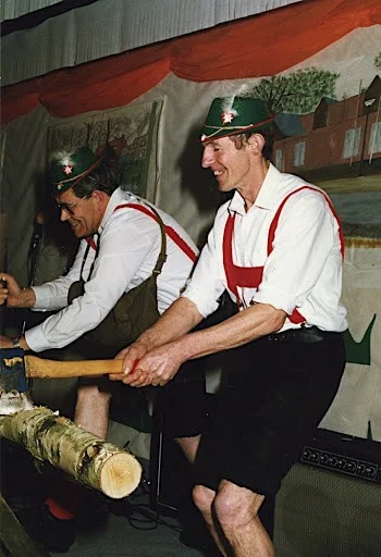 Natuurlijk werd het optreden van de Baumländers altijd een vrolijk gebeuren. Toon Verstraten en Toon Jans hakken er op los.