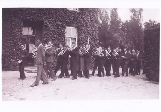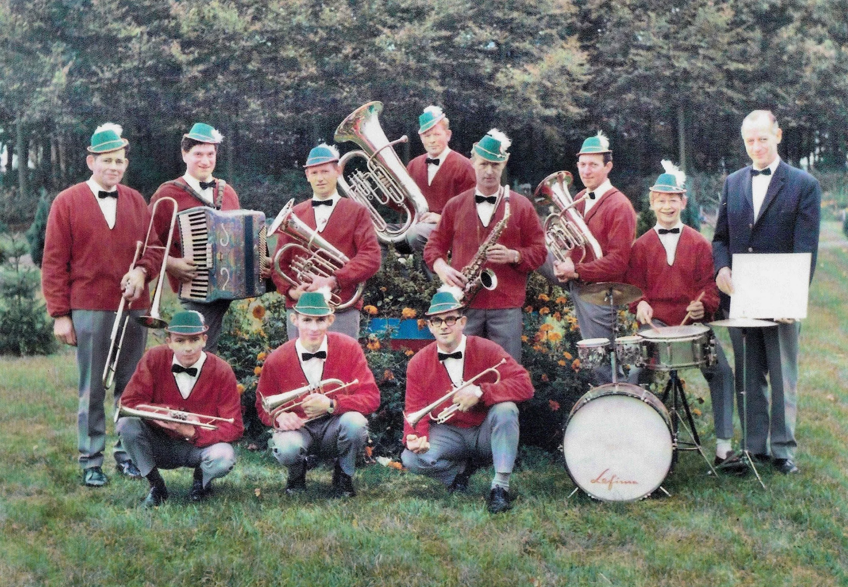 Zittend: Ben van Kuppeveld (instr) – Toon Ermers – Piet Brans – Wim Janssen (dir)- Hendrik Derks – Will van Raay – Jo Verstegen – Tiny v.d. Ven – Toon Theunissen – Jan Verstegen – Klaas van Kuppeveld – Pastoor H. van Ooy en Nico Peters