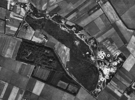Luchtfoto RAF op 19 sept. 1944. De bominslagen bij het Langven zijn duidelijk te zien. Klooster Russendaal is vrijwel niet te zien onder de bomen.