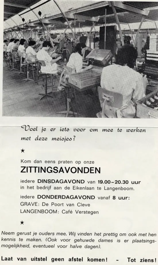 In Langenboom waren na de 2e Wereldoorlog een aantal boerenzoons naar Canada geëmigreerd, omdat er voor hen hier geen toekomst leek weggelegd. Toch waren er een aantal mannen die nog moeilijk aan werk konden komen en daarnaast waren er een behoorlijk aantal meisjes, die wel wilden gaan werken, maar ja in een fabriek …. dat hoorde nog niet in die tijd.