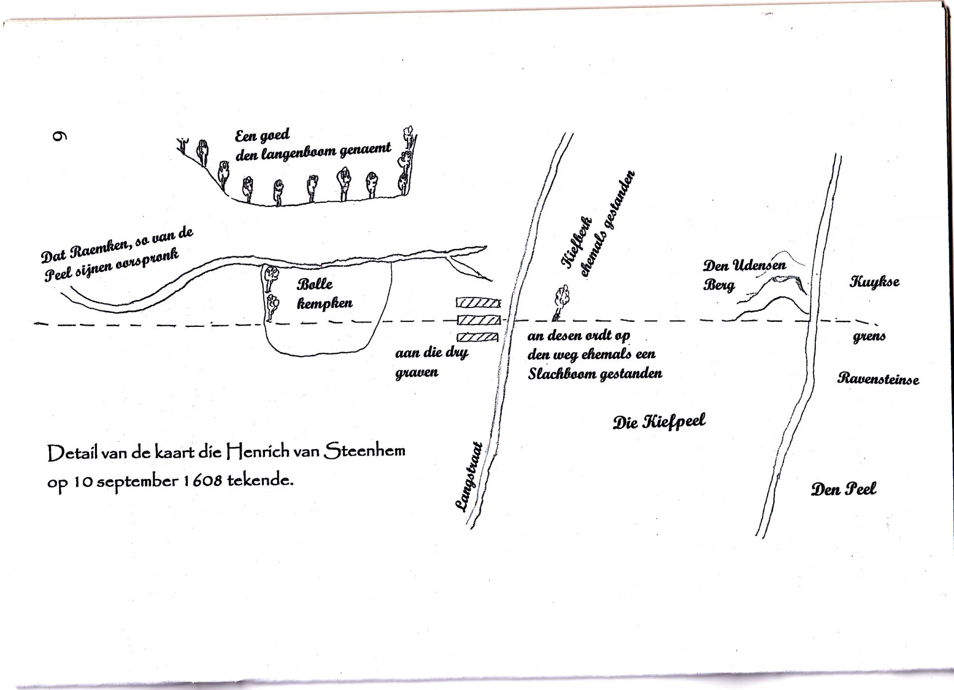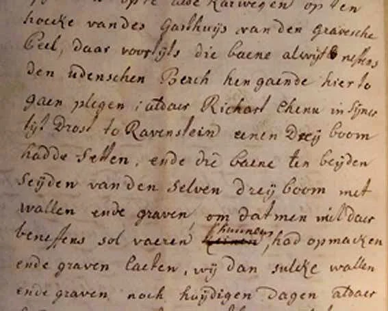 Er werd heel wat met elkaar besproken over de grens, maar waar het nu over gaat is, dat in het akkoord van 1570 staat, dat de grens o.a. kwam op de plaats waar: “Richart Chenu, in sijn tijt Drost to Ravenstein eenen Dreijboom hadden setten, ende die baene (weg) ten beijden seijden van den selven dreijboom met wallen ende graven (sloten), omdat men niet daer beneffens sol vaeren kunnen”.