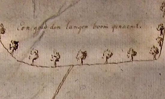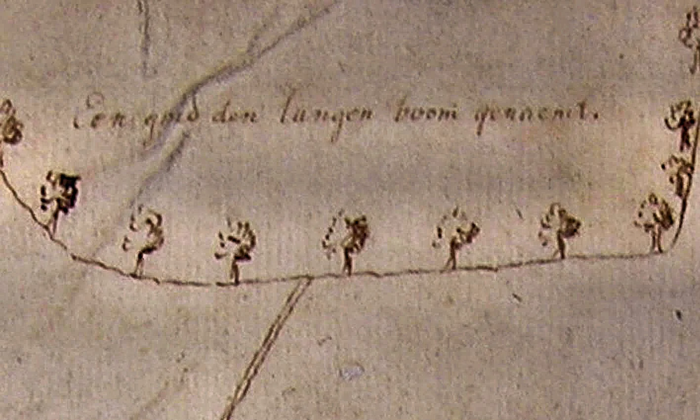 Op onderstaand kaartje uit 1610 is duidelijk te zien, dat er vele bomen stonden tussen Langenboom en Zeeland. De stippellijn is de toenmalige grens.