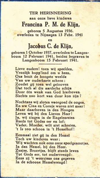 Nieuwe slachtoffers. Drie dagen later sloeg het noodlot wederom toe. Nu in het huis aan de Zuid Carolinaweg no1. Twee kinderen van Marinus de Klijn en Cato Janssen waren ernstig ziek. Ze gingen zienderogen achteruit. Op 12 februari was er voor het kleine Koosje (geboren op 1 october 1937) geen redden meer aan en overleed hij thuis. De volgende dag werd zijn iets oudere zusje Francina (geboren 5 augustus 1936) met grote spoed naar het ziekenhuis in Nijmegen gebracht. Bij aankomst was ze al overleden. Beiden werden op 15 februari begraven op het Langenboomse kerkhof. Hun grafje ( met foto’s) is nog steeds te bezoeken.