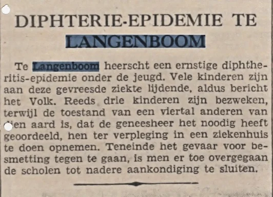 Wat een angst moet er in Langenboom geheerst hebben in het voorjaar van 1941. Een hevige difterie uitbraak had hier plaatsgevonden. Vele kinderen werden ernstig ziek. Langenboom werd landelijk nieuws. Allerlei kranten schreven erover.