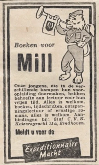 De vrijwilliger voor Indië, die zich vandaag aanmeldt en de strenge medische en politieke keuring doorstaat, kan over drie of vier dagen al op transport zijn naar Langenboom, een klein dorp, waarvan de huizen verspreid liggen over de vlakte van de Brabantse heide. Buurdorp Mill heeft voor het eerst naam gemaakt in de oorlogsdagen van 1940, toen het zwaar geteisterd werd. En ge behoeft thans maar even over de pas herstelde wegen te rijden, om te zien hoe wild de moderne oorlogsmachine er in de dagen van den corridor naar Nijmegen heeft huisgehouden. Ge rijdt er kilometers door een heideland, die in letterlijken zin uiteengereten is, bezaaid met bruine wrakken van stalen oorlogsmonsters en witte ruïnes van de machtige gebouwen van het vliegveld Volkel.