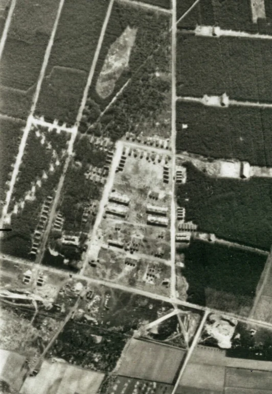 Hier een luchtfoto van de RAF 1945. Beneden van links naar rechts is de Graafseweg en de meest rechtse weg naar boven is de Heideweg. De weg die naar beneden gaat is de Maurikstraat. Duidelijk zijn de vele hutten en barakken te zien. Rechts in de bossen zijn kogelvangers van de schietbanen te zien.