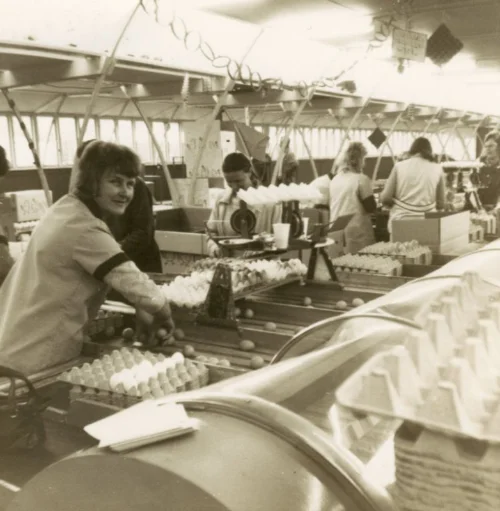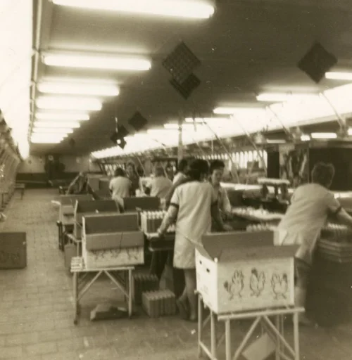 Eieren inpakken in gebouw aan de Eikenlaan: nu Van der Burgt snelbouw.