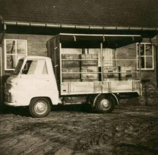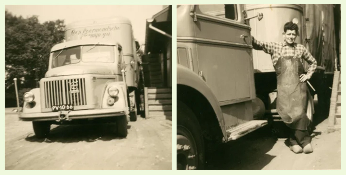 Auto, waarmee de eieren werden opgehaald en naar Roermond werden gebracht. Toon Verstraten bij de ophaalvrachtauto van de Roermondse Eiermijn