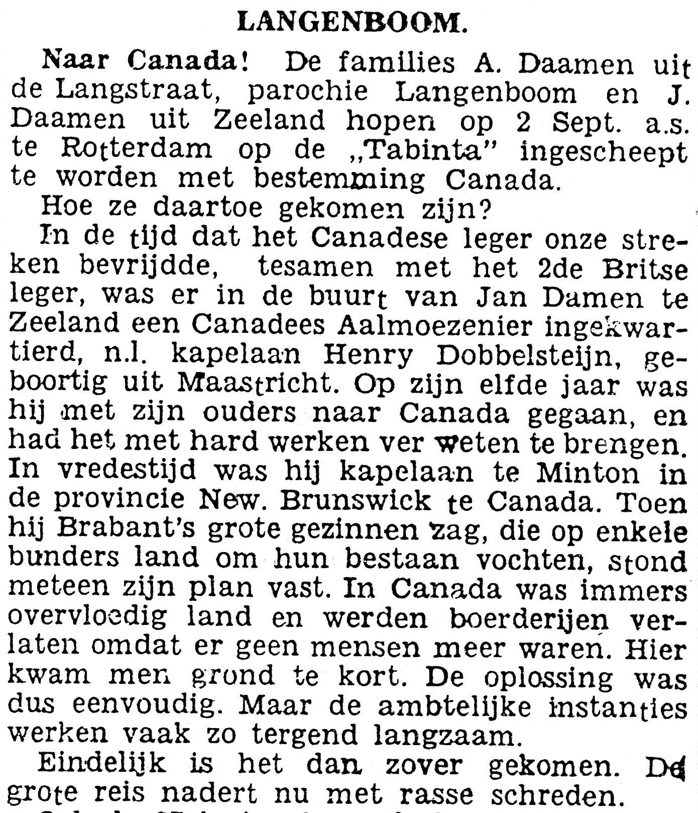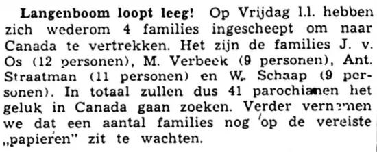 Eind jaren ’40 en beginjaren ’50 was er in Langenboom bijna geen onderwerp van gesprek, dat zo vaak terugkwam aan de keukentafel en ’s avonds als er gebuurt werd met kennissen. “Hedde da geheurd? Die van Van Os gaan ook al naar Canada.”