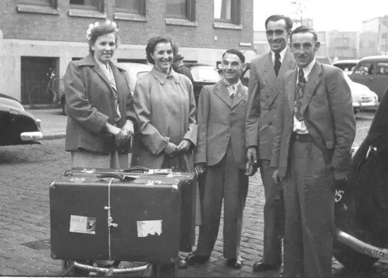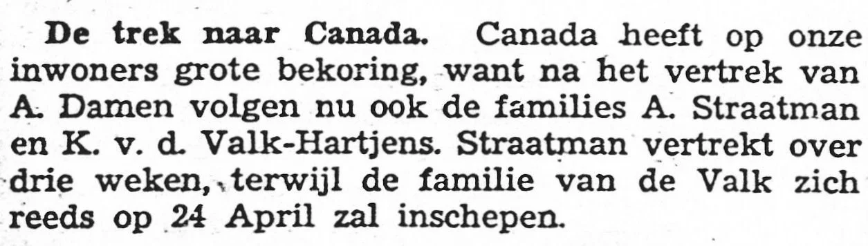 Men enkele kennissen en familieleden vertrok men in bussen naar meestal Rotterdam. Op de kade krioelde het van de nerveuze mensen. In een dichte mensenmassa ging het een enorme loods in, de douane voorbij; van de douane naar de dokter, van de dokter naar de scheepspapieren, van de scheepspapieren naar de geld- en passagecontrol en dan … eindelijk de gangweg naar het schip. Bekende schepen waren: De Waterman – de Groote Beer en de Zuiderkruis. De meesten sliepen in grote slaapzalen: 60 tot 180 per zaal. De gelukkigen sliepen in hutten (meestal 16 persoonshutten). De kinderen beneden de 12 jaar sliepen bij de vrouwen. De moeders hadden hun handen vol. Na een kleine twee weken kwam men vooraan in Canada aan. De meesten murw en nog zeeziek. Dan wachtte daar de Canadese immigratiedienst en de trein om hen na een lange reis op de plaats van bestemming te brengen. Wat stond hen te wachten?