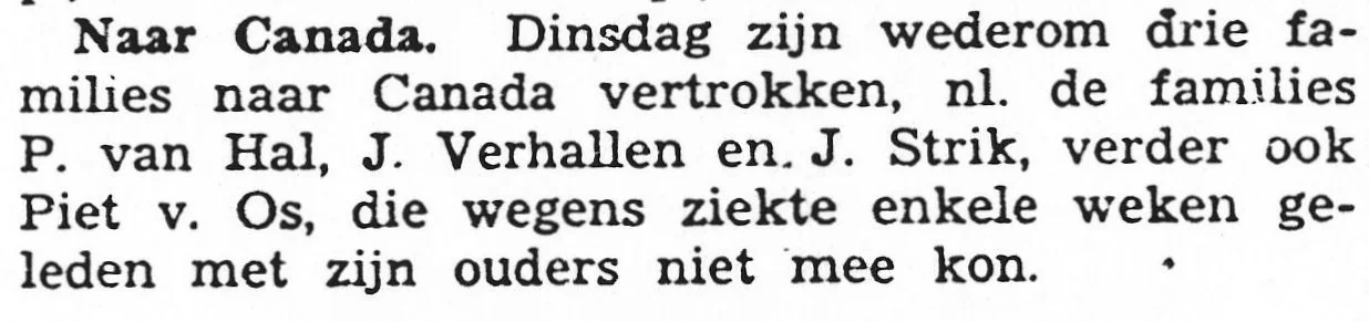 In juli 1948 vertrokken de gezinnen van Piet van Hal – J. Verhallen en J. Strik naar Canada. Hier het gezin in 1950 van Piet van Hal en Willemien van Zeeland voor hun nieuwe huis met de kinderen Martintje – Fransje – Piet en de meisjes Annie – Marietje en Wilhelmientje