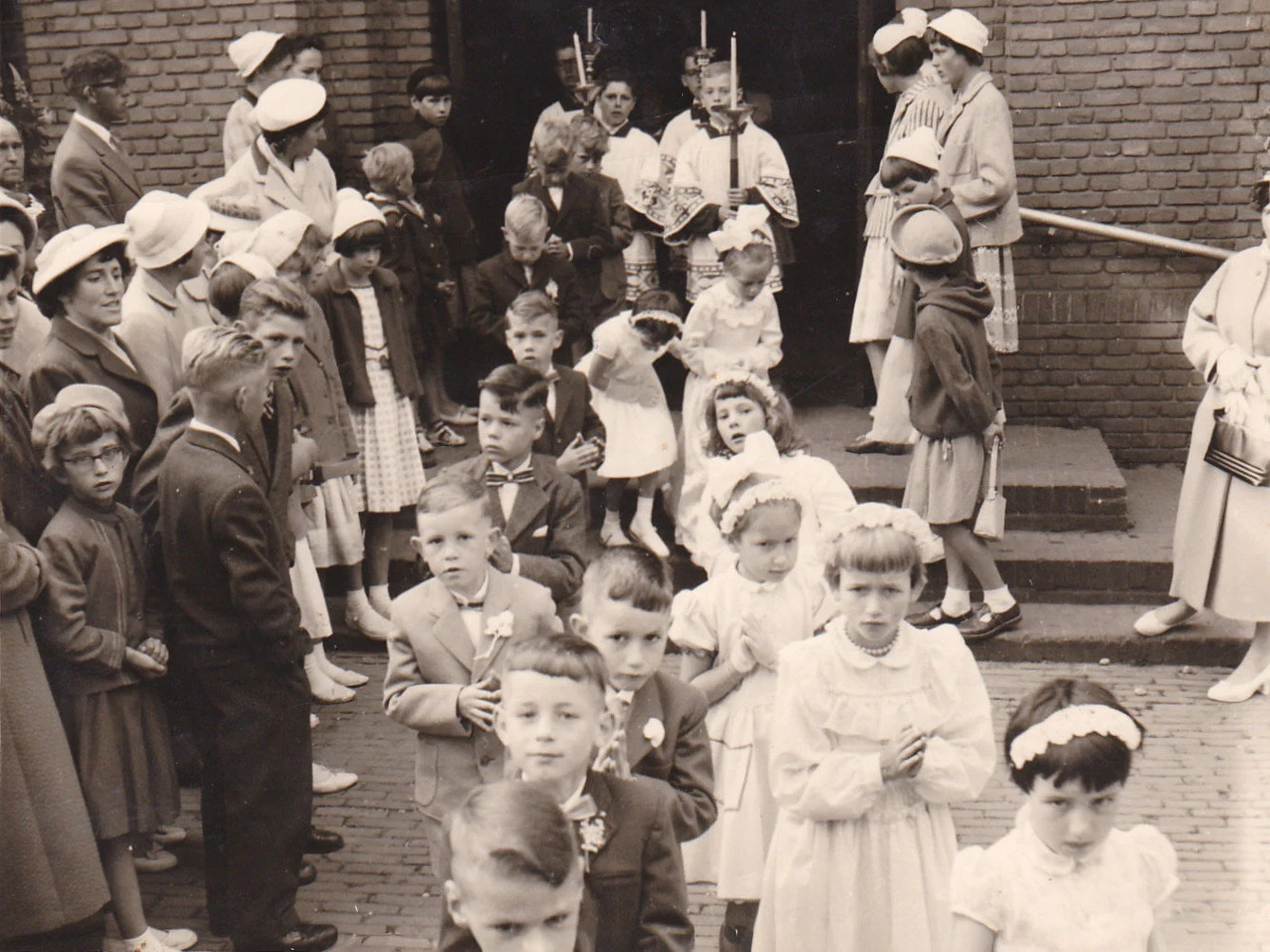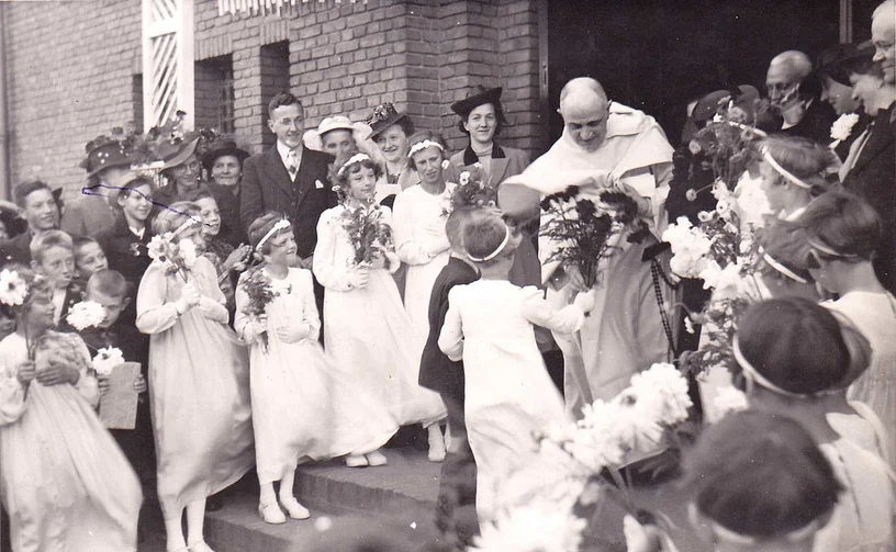 Plechtige communie bij pastoor De Boer. Klaar staan o.a. Christ Kuppen – Theo v.d. Wiel en Fientje Hendriks (met bril). Misdienaar Koos de Klijn.