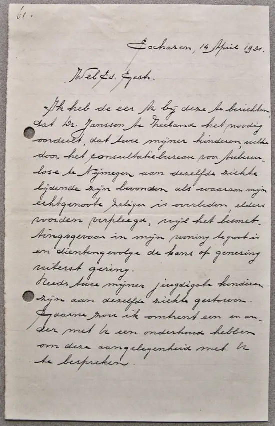 Zijn overleden echtgenote was Maria Bongers uit Zeeland, zij stierf op 23 januari 1931. Veertien dagen daarvoor, op 7 januari, had zoon Johannes het leven gelaten. Nog was het leed niet geleden, want op 8 april gaf dochter Maria de geest. En nu zijn er opnieuw twee kinderen besmet.