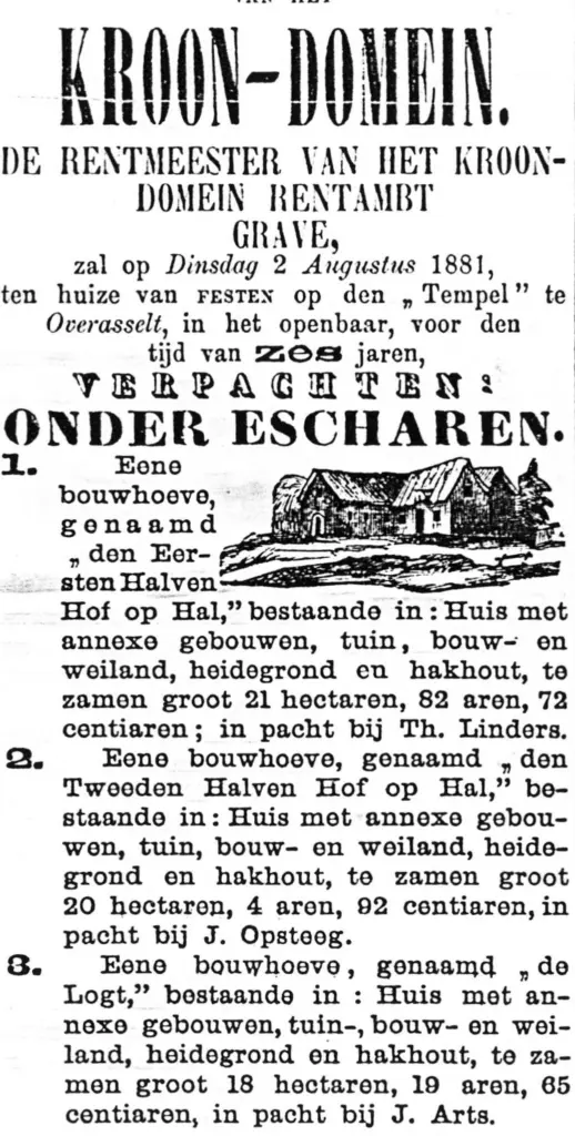 In een akte uit 1613 staat het als volgt beschreven: “Ontfang van de Bouwhoven op Hall en Peel in den Lande van Cuijk gelegen, toebehoorende hebbende de Abdije van Marienweerd en bij Sijne vorstelijke Genade (Prins Maurits) afgelost op den 22 September 1613 met zijn eijgen penningen voor een Somma van agt Duijsend guldens. 1. Den Hof genaamt Sandvoort 2. Den Hof genaamt Schaapsdijk 3. Den Hof genaamt de Logt 4. Den Hof genaamt Hoog Hal. 5. Op Hall een Bosje, genaamt het Hals Bosch enz.”.