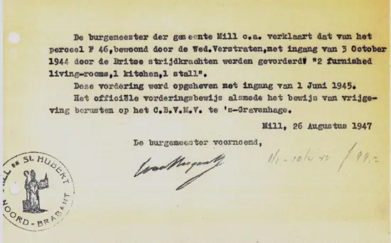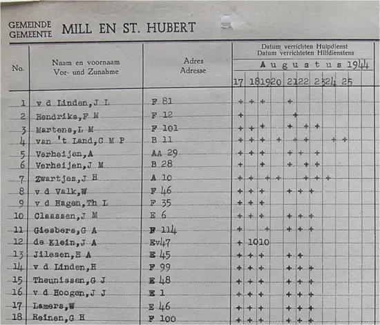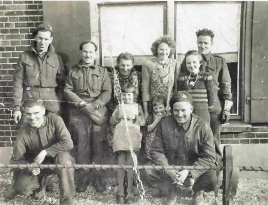 Vlnr. o.a. Gen. Dempsey – Koos Verstraten – Jan Bongers – Tonia Hartjes – Koning George VI – Miep Bens – Piet Bongers – Sjan Jans – Toon Bruuns (onderduiker) – Frans Kuijpers – Marietje Kuijpers – Broeder Thomas – Ad vd Horst – Jet van Kuppevelt – Marie Hartjes – Dina Hartjes – Marietje van Duijnhoven