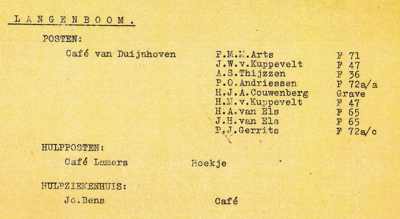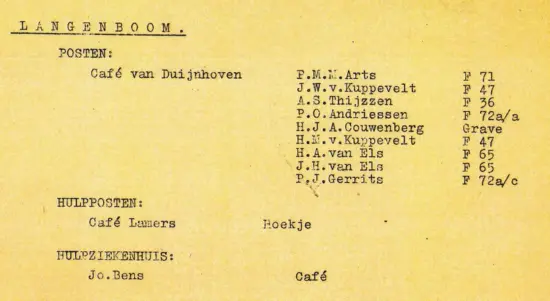 Voor het geval er strijd om Langenboom zou komen, werden overal posten gereedgemaakt en personen geïnstrueerd. Hier het overzicht van Langenboom. Gelukkig is het niet nodig geweest.