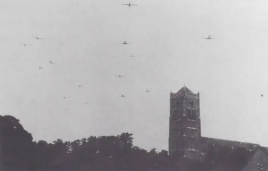 De lucht zag zwart van de vliegtuigen. Een enorm gebrom vulde het luchtruim. Boven Velp en Reek vlogen ze zeer laag, vlak boven de huizen.