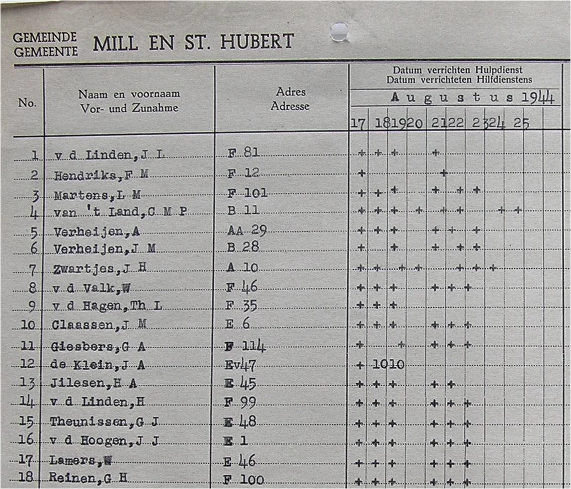 Het werken op het vliegveld was ook zeer gevaarlijk, want bij voortduring was er luchtalarm en dan ging het zo snel mogelijk richting Oventje of Den Trent naar de Halte Zeeland nabij de familie Franken, waar ze 12 zoons hadden, de 12 apostelen. De mensen moesten brood en eten zelf meenemen en kregen geen vergoeding. Ook kwam er via de gemeente een regeling dat een 20-tal mensen moest werken aan schuttersputjes langs de weg van ’t Huukske naar Mill. Deze weg diende ervoor om aanvallen af te slaan door de Duitsers. Duitse soldaten op de fiets reden over de weg om toezicht te houden.