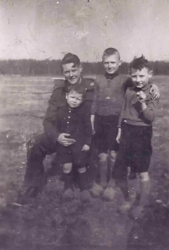 Engelse militairen bij de smederij van Frans van Schayik. Op de foto Truus van Schayik-Lam en de kinderen Annie en Leentje. Naast haar Anna Verstegen, zij werkte bij Van Schayik