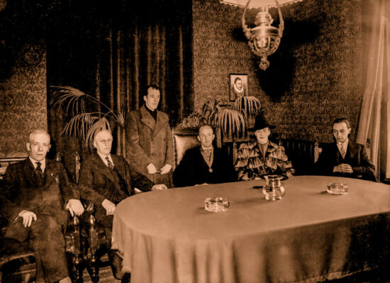 Het laatste college van de gemeente Escharen in 1941: v.l.n.r.: wethouder Jan Arts – wethouder M. Roelofs – onbekende – burgemeester H. Muijser en echtgenote – secretaris M. Peeters