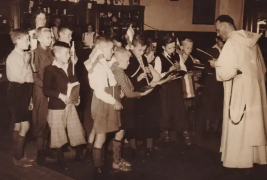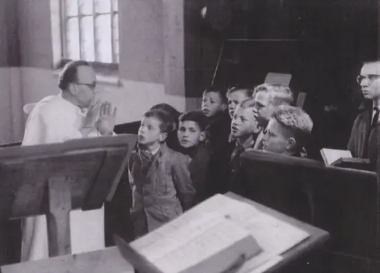 Onder toeziend oog van meister Janssen dirigeert kapelaan Van den Idsert de Mariamerels Jan Verstegen – Harry van Lith – Tiny Brans – Chris Brans -Leo Peters –