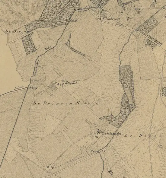 De Kroondomeinen in 1860: De hoeven De Zandvoort – Hooghal (1e en 2e Hof van Hal) – de Schaapsdijk en links onder De Locht.
