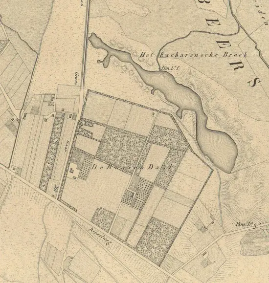 Omgeving ‘t Huukske-Russendaal in 1860: Het Jezuïeten buitenverblijf Russendaal was er nog niet. Het Langven, was toen nog een lang ven tot aan de Hoge weg.