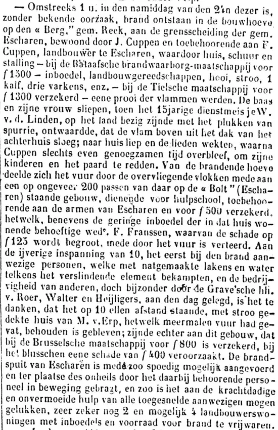 Zekerheid hierover kregen we door wat er in de Graafsche Courant stond omtrent een brand in de Lage Heide. (Zie afdruk hiervan). Hieruit blijkt, dat er op 24 juli 1868 brand is ontstaan in een boerderij van Francis Cuppen, bewoond door Jan Cuppen, aan de Reekse kant van de Hoge Raam. Aan de Lageheide zijde van de beek, tegenover het huis van Maarten van Erp (nu Erik van Boekel-Liefkenshoekseweg 6) stond aan de andere zijde van de weg het huis van het Armenbestuur, bewoond door de weduwe Francisca Franssen, met als aanbouw de Hulpschool.