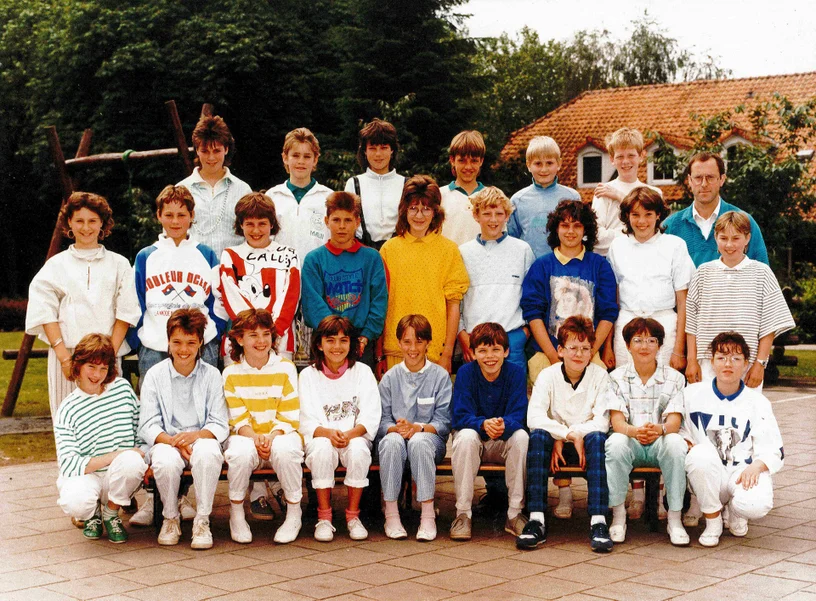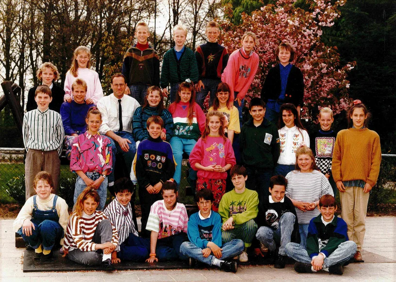 1e Rij staand: Twan van Hout – meester Martien Arts – Frank van Limbeek – Ans Rongen – Sonja de Klein – Anita Vervoort – Claudia Hendriks – Herwin Hopmans – Pim de Klein – Johnny Kremers – Chiel v.d. Horst – Arjan Emons – Eugène Verstegen – Hedwig Rigters – Hedwig Arts – meester Toon Ermers en Eddie Strijbosch