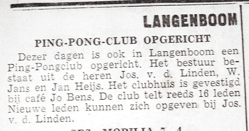 al in de jaren 50 werd de tafeltennissport in Langenboom in clubverband uitgeoefend. Van 1953 tot 1959 functioneerde er een vereniging, die op haar hoogtepunt zo’n 30-40 leden telde. De leden hadden zelf een tweetal speeltafels gemaakt met behulp van schragen, dwarsbalken en platen. Deze tafels zijn door opvolger Taflan in de beginjaren nog intensief gebruikt.