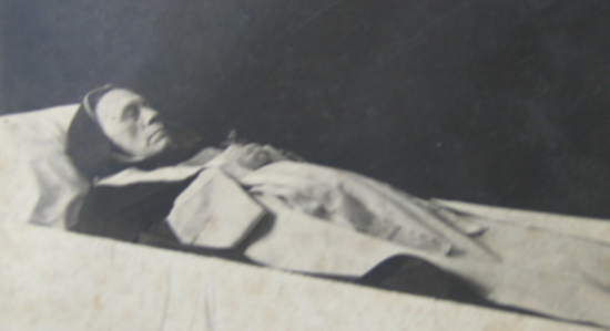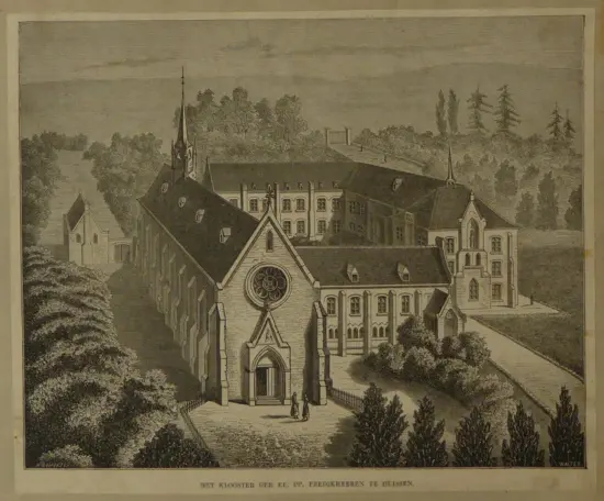 Het klooster in Huissen rond de eeuwwisseling 1900. Rechts op het veldje naast de ingang van de kapel is tegenwoordig de grafkelder gelegen. Daar is Thomas Van Hoogstraten te ruste gelegd
