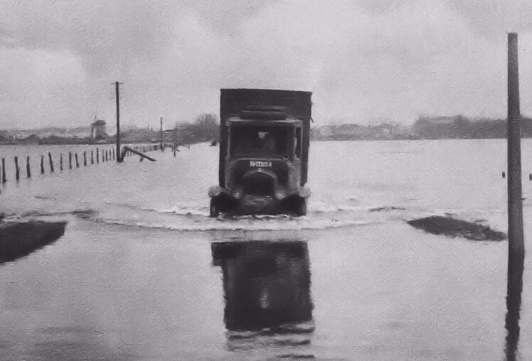 De vrachtauto N-17204 van Martien Jans helpt hier in 1926 bij de overstroming van de Maas bij Grave