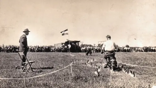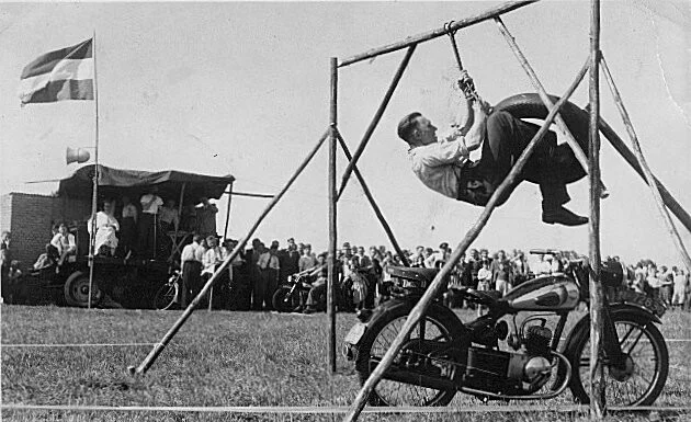Jan Roefs haalt hieronder capriolen uit bij een motorbehendigheidswedstrijd achter café Bens
