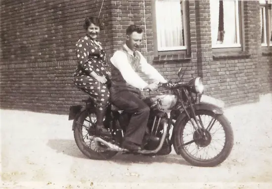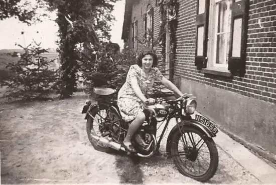 Mimi Jordens-van Duijnhoven op de motor van haar man. Later had ze er zelf een.
