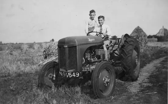 Tractor van Martien Jordens. Chauffeur is onbekend. Erbij zit zoon Toontje,
