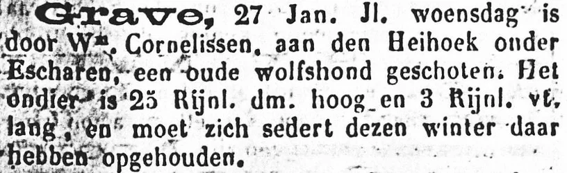 Bij toerbeurt moesten drie bekwame schutters op een afstand de wacht houden met hun geweer om de wolf neer te leggen, wanneer die op deze aantrekkelijke aas zou afkomen. Deze maatregelen zouden net zo lang van kracht blijven totdat men dacht, dat er geen wolven meer over waren. Naderhand horen we nauwelijks meer van verscheurende wolven in onze streek, behalve een enkel verdwaald exemplaar, want wolven kunnen wel 50 km op een dag lopen. De laatste wolf die geschoten werd was eind januari 1872 op de Heihoek onder Escharen.